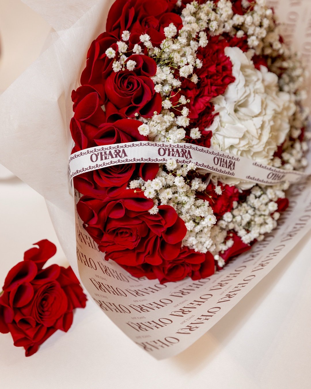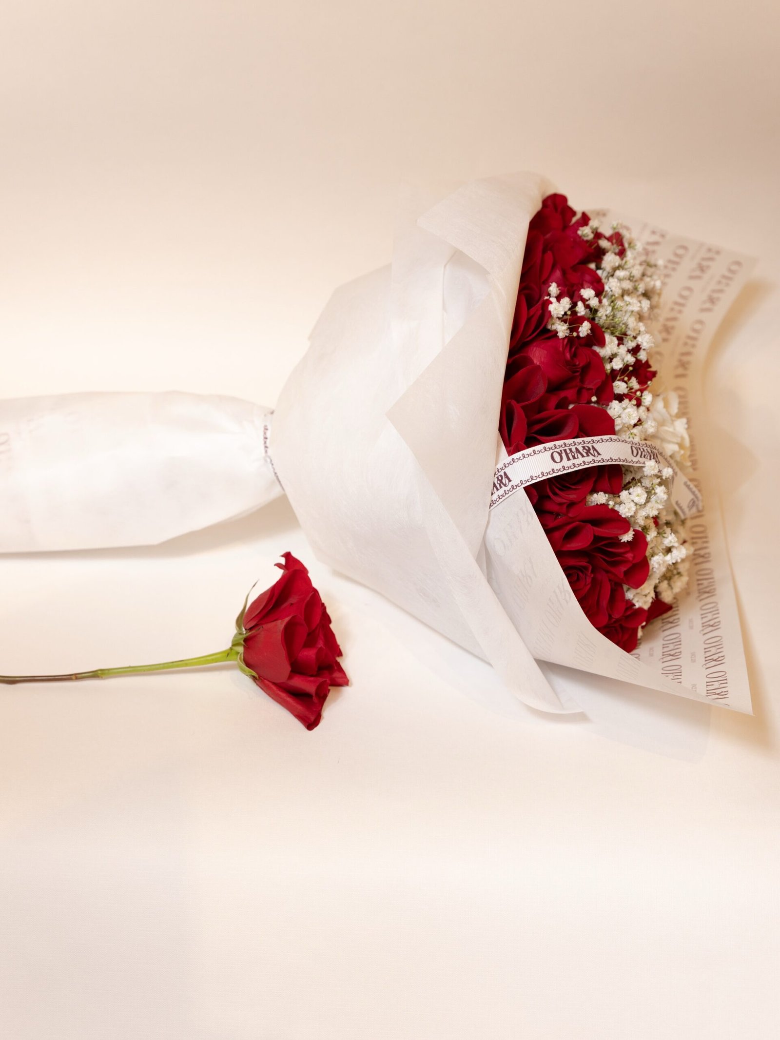 باقة زهور هاند بوكيت من زهور الروز فريدوم تحتوى على عشرين زهرة مع تغليف ورقي وشرائط العلامة التجارية ،،